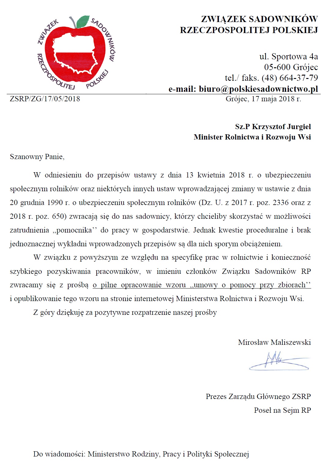 Poniżej do zapoznania odpowiedź Ministerstwa Rolnictwa i Rozwoju Wsi na nasz wniosek o przygotowanie wzoru umowy o pomocy przy zbiorach.