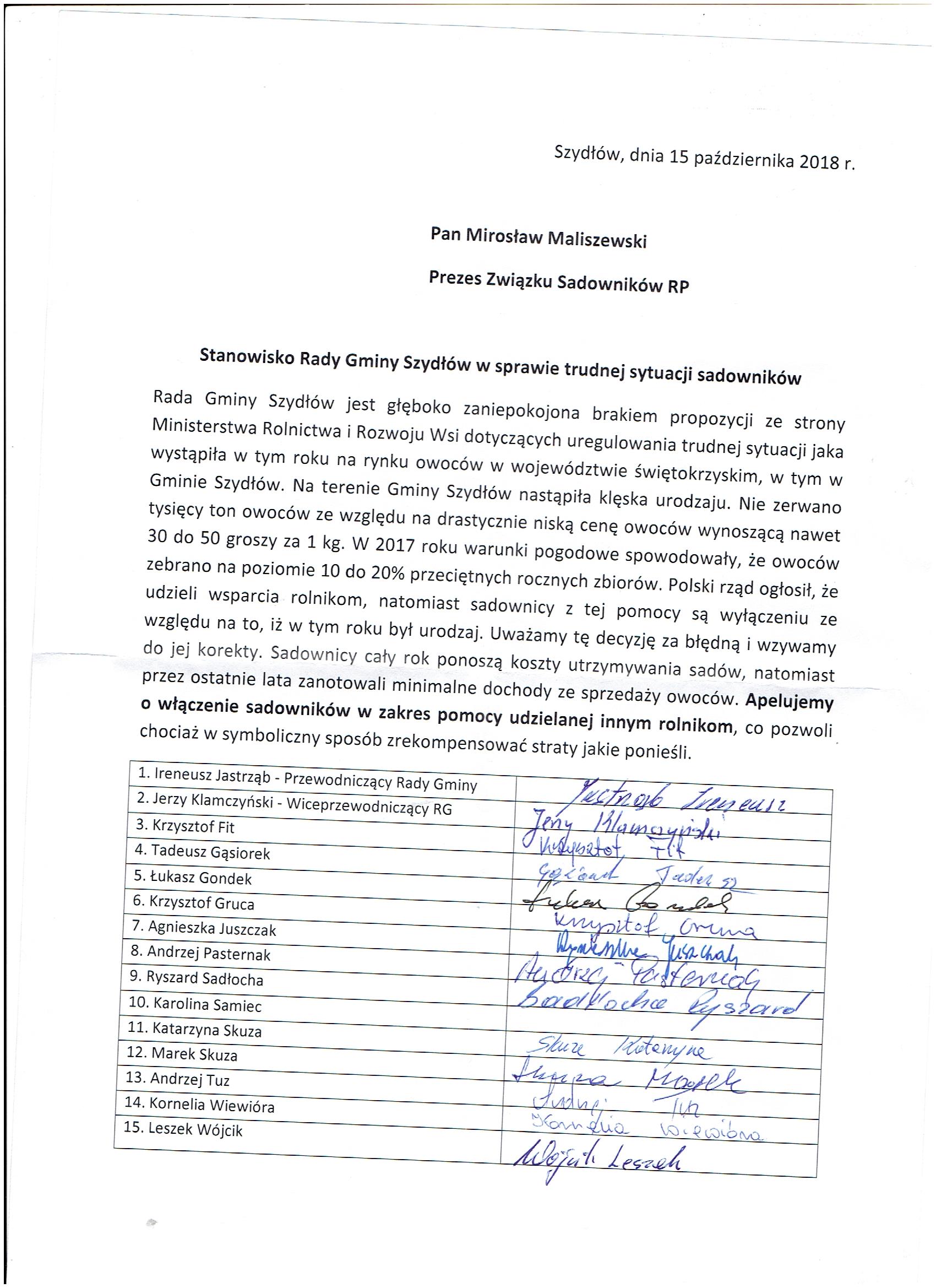 Stanowisko Rady Gminy Szydłów w sprawie trudnej sytuacji sadowników