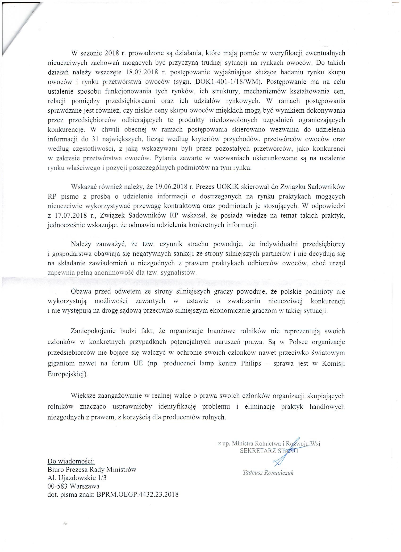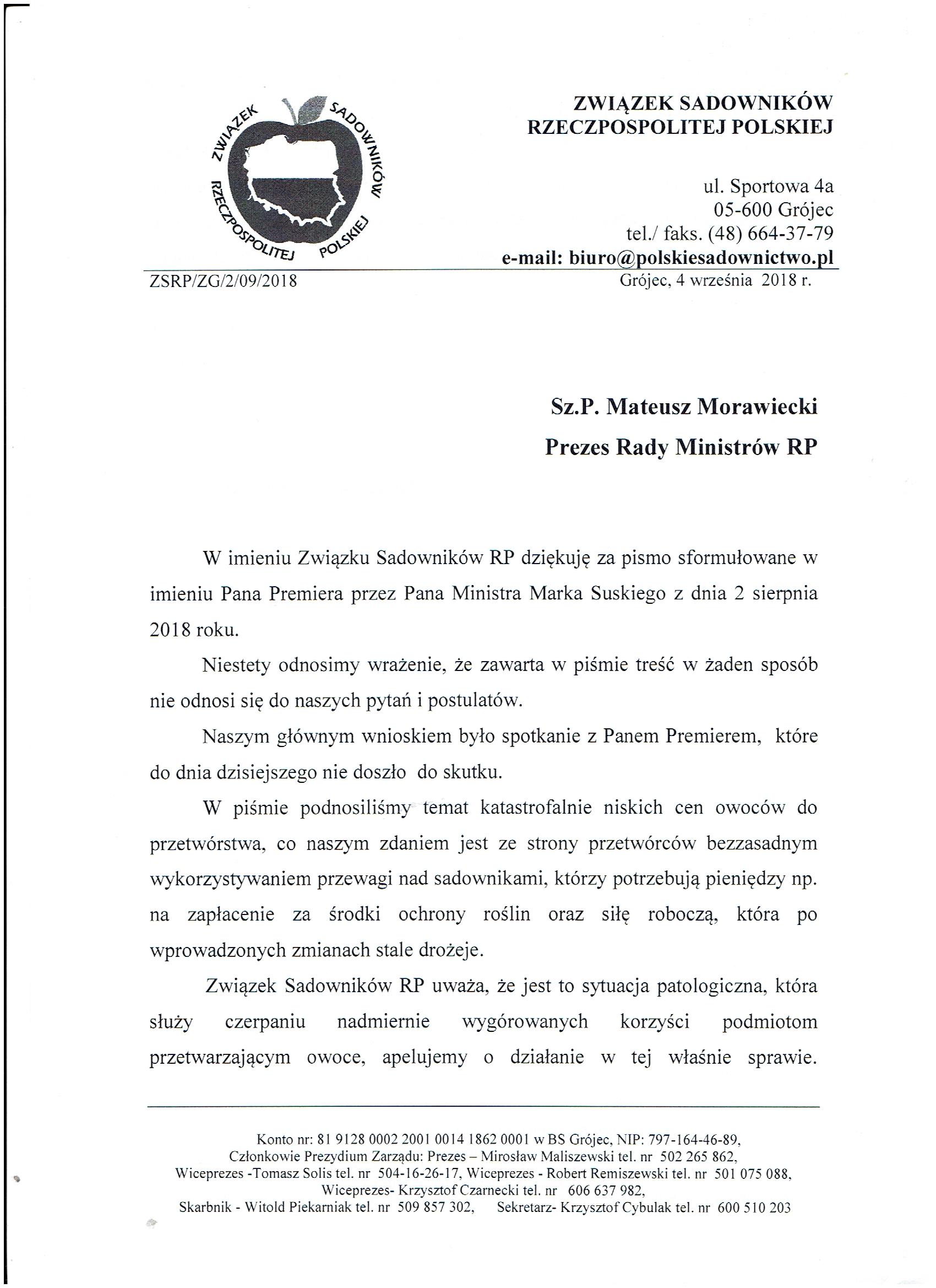 Na początku września po raz kolejny zwróciliśmy się do Premiera Morawieckiego z prośbą o spotkanie oraz o przeanalizowanie naszych wcześniejszych postulatów w związku z katastrofalnie niskimi cenami owoców. Postulaty były naszym zdaniem możliwe do zrealizowania, niestety nie spotkały się one z żadną uwagą ze strony rządzącej. W piśmie apelowaliśmy także o sprawdzenie możliwości wystąpienia zmowy cenowej wśród podmiotów skupujących/przetwarzających owoce. Niestety prośba o spotkanie pozostała bez echa, a dziś po ponad dwóch miesiącach otrzymaliśmy odpowiedź na nasze pismo.