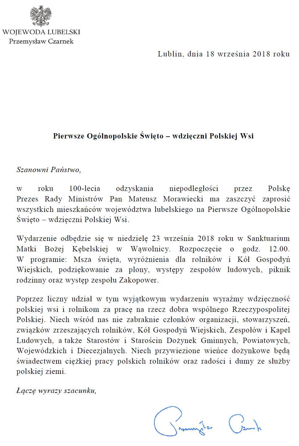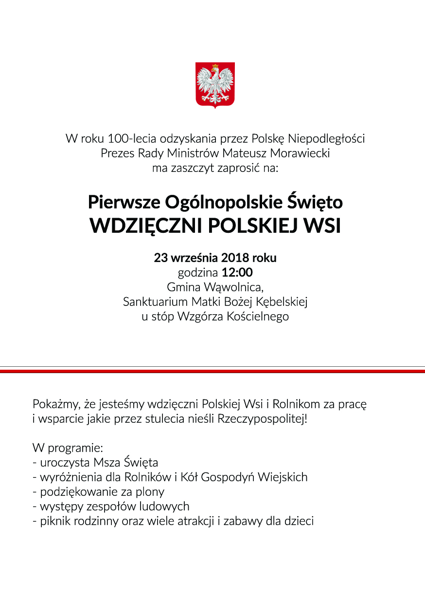 Prezes Rady Ministrów Pan Mateusz Morawiecki zaprasza wszystkich mieszkańców województwa lubelskiego na Pierwsze Ogólnopolskie Święto – wdzięczni Polskiej Wsi.