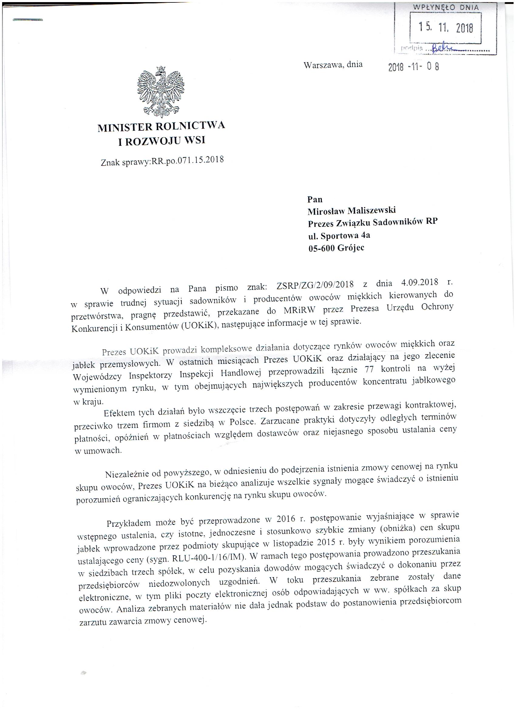 Na początku września po raz kolejny zwróciliśmy się do Premiera Morawieckiego z prośbą o spotkanie oraz o przeanalizowanie naszych wcześniejszych postulatów w związku z katastrofalnie niskimi cenami owoców. Postulaty były naszym zdaniem możliwe do zrealizowania, niestety nie spotkały się one z żadną uwagą ze strony rządzącej. W piśmie apelowaliśmy także o sprawdzenie możliwości wystąpienia zmowy cenowej wśród podmiotów skupujących/przetwarzających owoce. Niestety prośba o spotkanie pozostała bez echa, a dziś po ponad dwóch miesiącach otrzymaliśmy odpowiedź na nasze pismo.